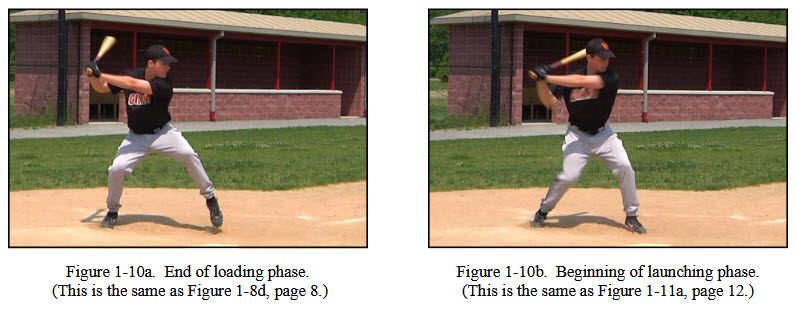 1)The Continuation of the Timing step. The timing step began in the loading phase when the front leg was raised off the ground and weight was momentarily rocked onto the back leg. See Figure 1-10a on the previous page. Now, the continuation of the timing step is the first part of the launching phase. Depending on the player’s technique, the timing step of the front foot can actually be a short stride towards the pitcher by a few inches and perhaps more, or it can simply be placed back down on the ground as shown in Figure 1-10b on the previous page.