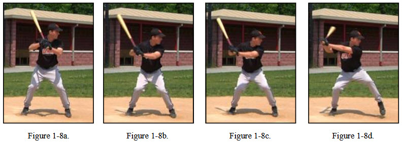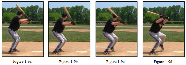5) The Cocking of the wrists. Cocking of the wrists is an action the hands perform on the bat handle at the tail end of the loading phase (Figure 1-10a) and into the first part of the launching phase (Figure 1-10b). It’s purpose is to break inertia, or prevent the bat from coming to a dead stop, and create a rapid recoiling effect with the bat-head at the end of the player’s furthest backswing.