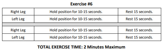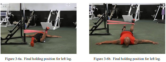 The video shown above demonstrates how to perform this exercise one time with the right leg and one time with the left. The final hold position for the right leg is shown in Figure 3-6a below. This position is held for 10-15 seconds using between 70-80% of your maximum strength. The same is then performed with your left leg as shown in Figure 3-6b below.
