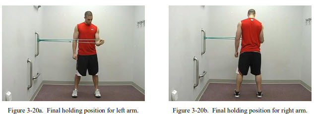 The video shown above demonstrates how to perform this exercise one time with the left arm and one time with the right. The final hold position for the left arm is shown in Figure 3-20a below. This position is held for 10-15 seconds using between 70-80% of your maximum strength. The same is then performed with your right arm as shown in Figure 3-20b below.